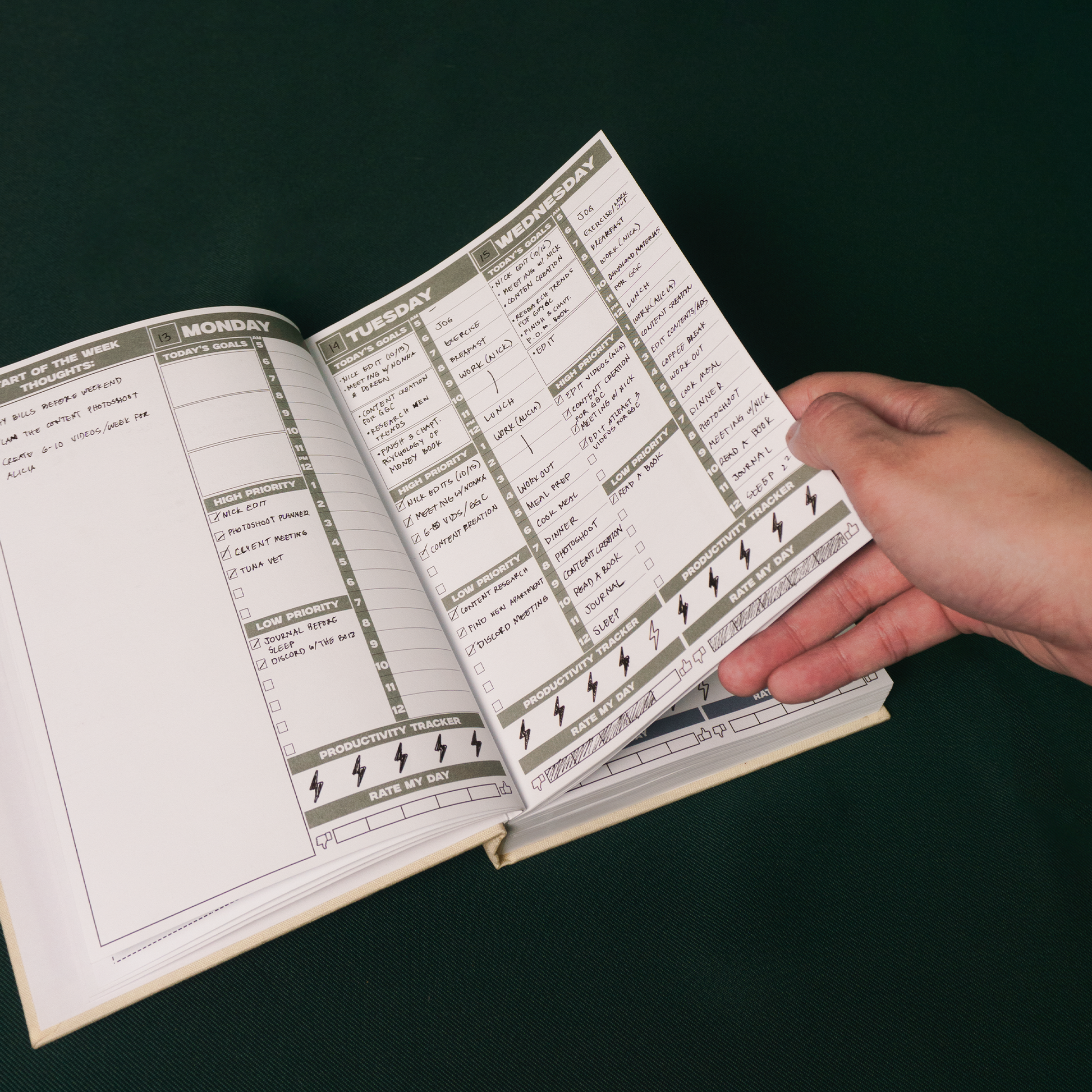 PLAN YOUR DAYS WITH GOAL SETTING, TO-DO LISTS SPLIT BY PRIORITY, TIMEBLOCKING, END OF DAY PRODUCTIVITY AND RATE MY DAY TRACKER.